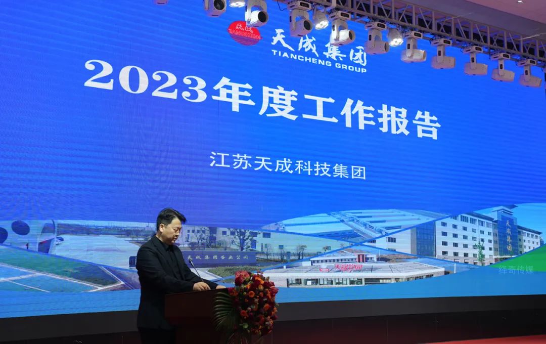 在熱烈的掌聲中,陳敏總裁代表集團經(jīng)營層作了題為《堅守初心 勠力同心——以堅定的戰(zhàn)略定力續(xù)寫天成發(fā)展新篇章》的2023年度總結(jié)報告暨2024年新春動員講話。